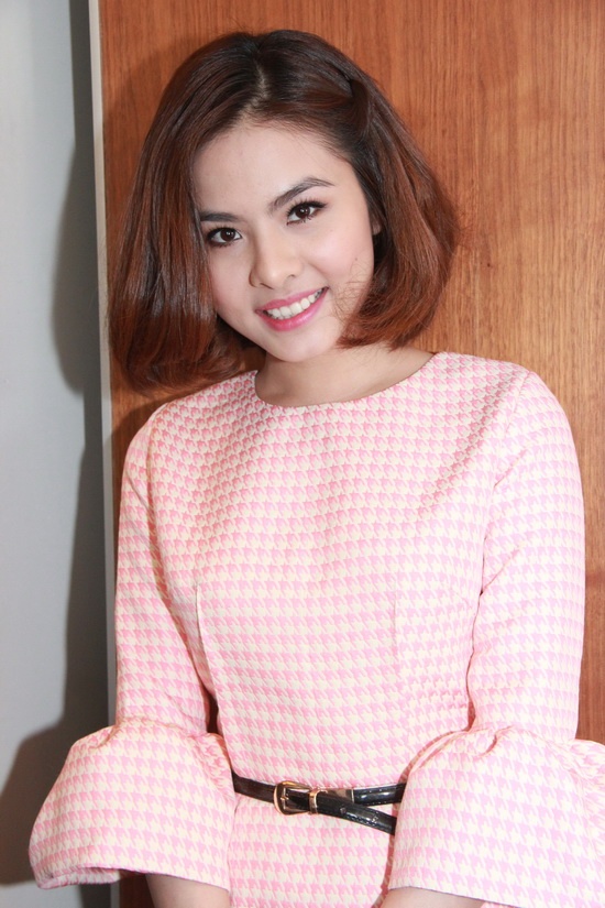 | Người đẹp vẫn hoàn toàn tự tin để những kiểu tóc xoăn hất lệch, lộ khuôn mặt đẹp mặn mà, tươi tắn chứ không hề chọn cách dùng tóc lòa xoà che mặt tròn giống nhiều phái đẹp khác hay dùng. |