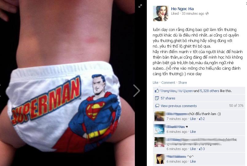 | Còn với Hồ Ngọc Hà, cô chọn cách đáp trả Thanh Lam bằng bức hình khoe mông con trai cùng dòng chia sẻ: "Ai cũng có quyền yêu thương, ghét bỏ nhưng hãy sống đúng với nó, yêu thì thổ lộ, ghét thì bỏ qua… Ai cũng đáng để mình học hỏi không phân biệt già trẻ, lớn bé, màu da, ngôn ngữ nhé Subeo. Vỗ nhẹ vào mông cho hiểu, não càng đánh càng tổn thương”. |