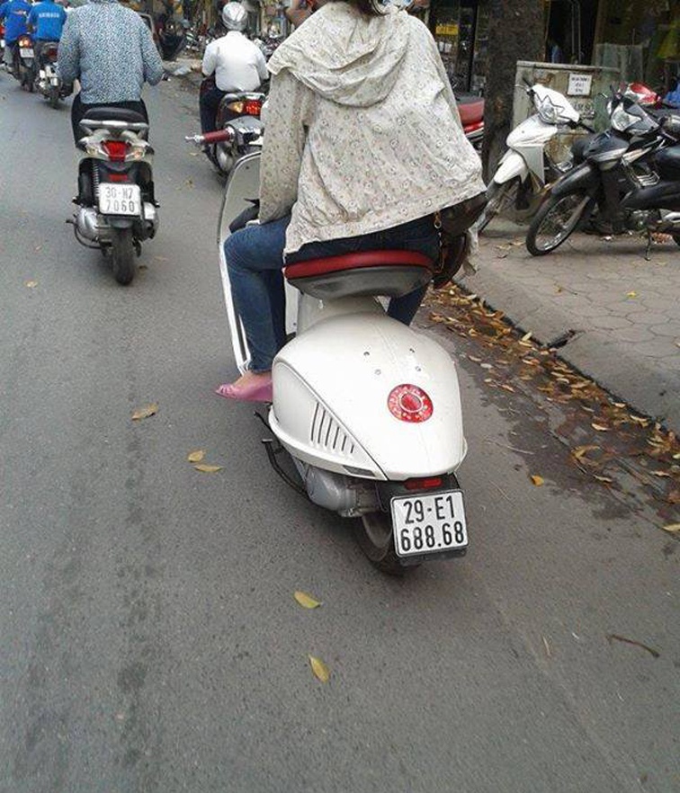 | Siêu phẩm Vespa 946 được Piaggio bán ra thị trường với giá 340 triệu đồng, mức giá cao nhất cho một mẫu xe của hãng tại thị trường Việt Nam. Dường như để tương xứng với giá trị của chiếc xe, nhiều người sau khi mua xe về đã gắn thêm cho siêu phẩm này biển số rất độc đáo, ví dụ như biển số đối xứng ở hình trên. |