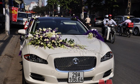 | Jaguar XJL SuperSport đời 2011 màu trắng với dải hoa hồng trắng và tím làm xe hoa trong đám cưới của một đại gia Hà Nội tháng 5/2012. |