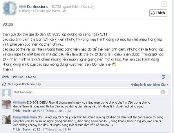 Trên trang confession (thú tội) của một số trường ĐH, nhiều sinh viên cũng bày tỏ sự phẫn nộ đối với những hành động yêu đương quá lố trong giờ học của các cặp đôi. Một confession đầy bất bình: “Thân gửi đôi trai gái… lớp Đường lối sáng ngày 5/11, các cậu có thể ra công viên nào đó để thể hiện tình cảm, nhưng đây là trong lớp và còn ngồi trước mặt bao người mà các cậu vẫn làm được thế thì đúng là không chấp nhận được. Trong giờ học, tớ không nhận mình là một đứa chăm nhưng vẫn muốn nghe giảng nên mới đi học, thế nên các hành động không đúng mực của các cậu mong đừng xuất hiện ở trên lớp nữa nhé”.