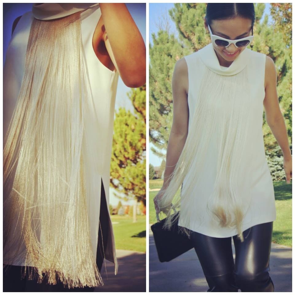 | Tua rua vốn là xu hướng của mùa thu đông 2014 và Huyền Ny là một trong những sao Việt làm lan toả phong cách này. Chiếc áo gam trắng đơn giản được nhấn bằng phần tua rua loà xoà và hút mắt trước thân áo. |