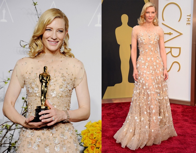 Không chỉ chiến thắng tượng vàng Oscar 2014 với danh hiệu Nữ diễn viên chính xuất sắc nhất, Cate Blanchett còn thành công khi biết cách thu hút toàn bộ ống kính của giới truyền thông từ bộ trang phục - trang sức lộng lẫy có mức giá đến 18,1 triệu đô la Mỹ.