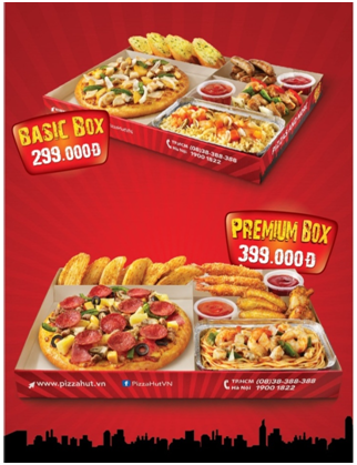 Lần đầu tiên xuất hiện tại Việt Nam, Big Box mang đến cho bạn một phần ăn đầy đủ, dinh dưỡng, tiện lợi và cực kỳ tiết kiệm. Big Box là một phần ăn thông minh 5 trong 1 cho 4 người cùng thưởng thức, bao gồm bánh pizza, cánh gà chiên, tôm, khoai tây, mì Ý hải sản… trong cùng một hộp lớn. Phần ăn đa dạng này giúp mọi người có nhiều lựa chọn tùy theo khẩu vị của mình.