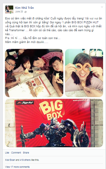 Chỉ cần một cú điện thoại đến cửa hàng Pizza Hut gần nhất, bạn sẽ có ngay một phần Big box được giao đến tận nơi với giá chỉ 299.000 đồng/hộp Basic, 399.000 đồng/ hộp Premium cho 4 người cùng ăn. Ngoài ra, bạn còn có cơ hội cào trúng thưởng 100% vé xem phim bom tấn mùa hè này - Transformers hoặc một lon coke mát lạnh.
