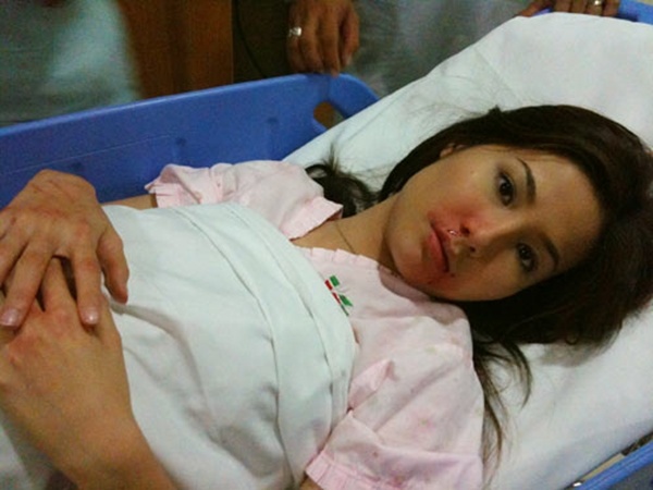 | Lã Thanh Huyền (vai Mai) với cảnh quay bị xe đâm. |