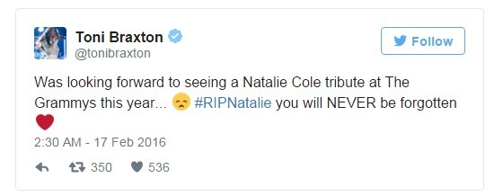 "Trông đợi để được xem màn tưởng nhớ Natalie Cole tại Grammy năm nay... Thật buồn. #HãyYênNghỉ Natalie. Cô sẽ không bao giờ bị lãng quên" - Toni Braxton chia sẻ trên trang mạng xã hội.