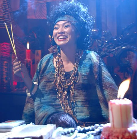 | Tạo hình của Phương Thanh với vai thầy bói đồng bóng trong phim Nụ hôn thần chết cũng khiến khán giả phì cười. |