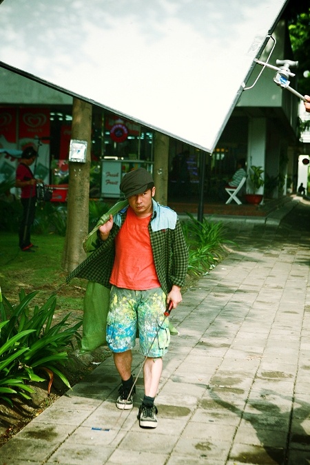| Bất cứ ai cũng phải ngạc nhiên và ngỡ ngàng khi nhìn thấy cảnh nam ca sĩ nổi tiếng đội nón lá rách, cầm ca nhựa bò lê trên phố trong bộ dạng của người ăn xin. |