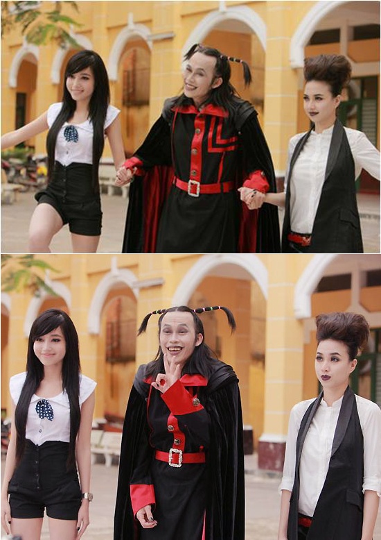 | Sang tới Gia sư nữ quái ra rạp hồi tháng 6 năm ngoái, tạo hình của Hoài Linh là tay sát thủ Tàu Hũ với ngoại hình một màu đen và mái tóc buộc lệch. |