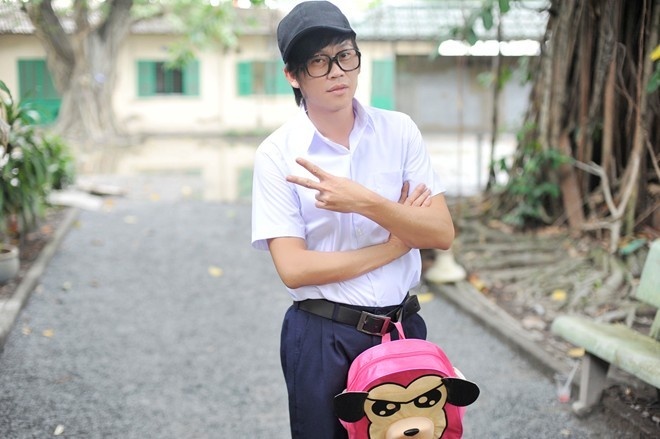 | Bởi vậy, danh hài nổi tiếng có khá nhiều tạo hình nam sinh ngộ nghĩnh khi đã qua tuổi 40 với quần áo đồng phục, đeo balo sặc sỡ. Dù bị cho là “cưa sừng làm nghé” nhưng Hoài Linh khẳng định anh là “đại ca giả danh học trò”. |
