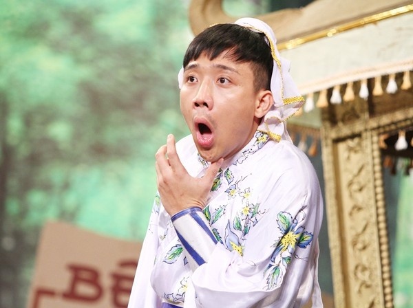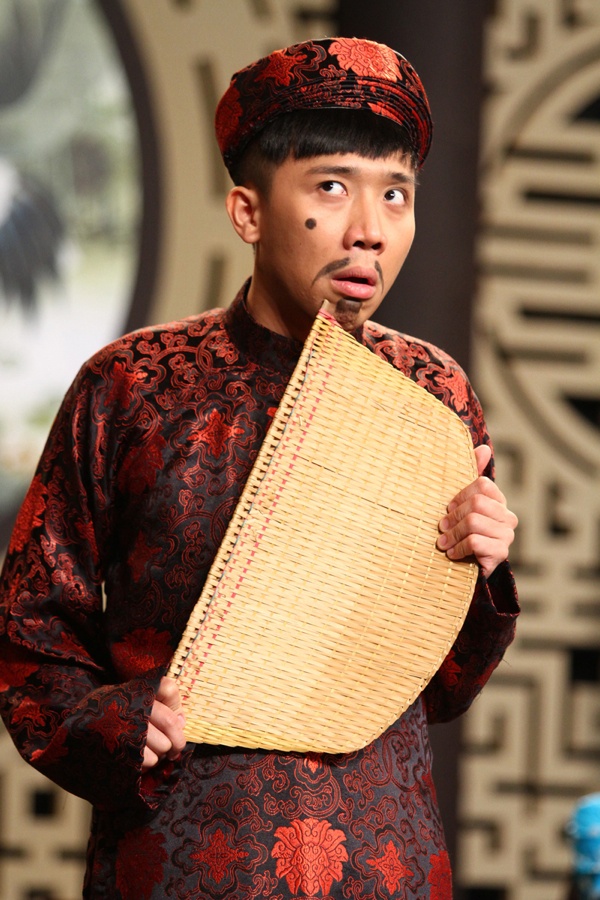 | Trấn Thành làm gã Trùm Sò xui xẻo và ham ăn trong vở hài kịch Ngao Sò Ốc Hến với nốt ruồi trên má. |