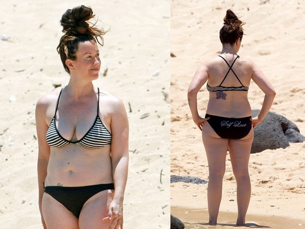 | Alanis Morissette lộ thân hình quá phì nhiêu trong kiểu bikini dành cho bà nội trợ. |