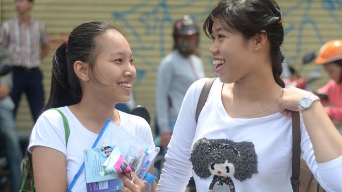 | hí sinh vui vẻ sau khi hoàn tất bài thi môn cuối cùng tại trường ĐH Khoa học xã hội và Nhân văn sáng 10/7. |