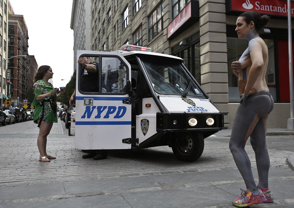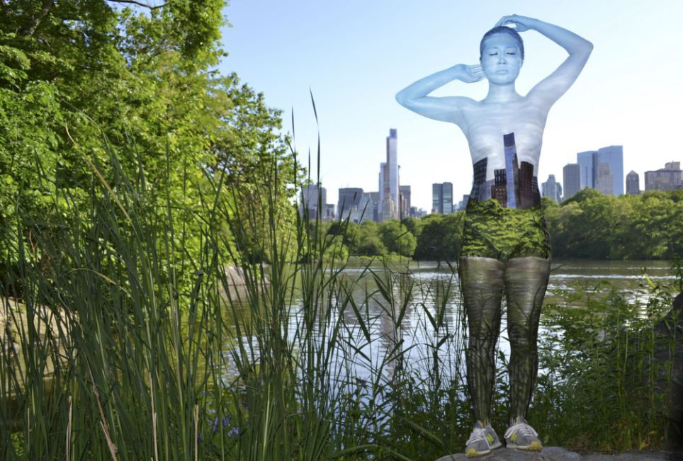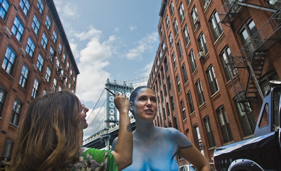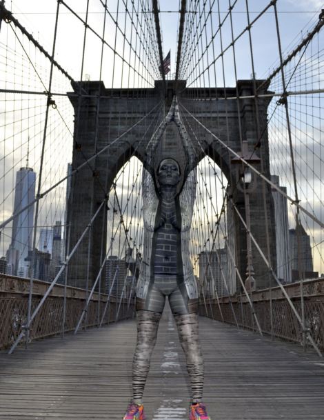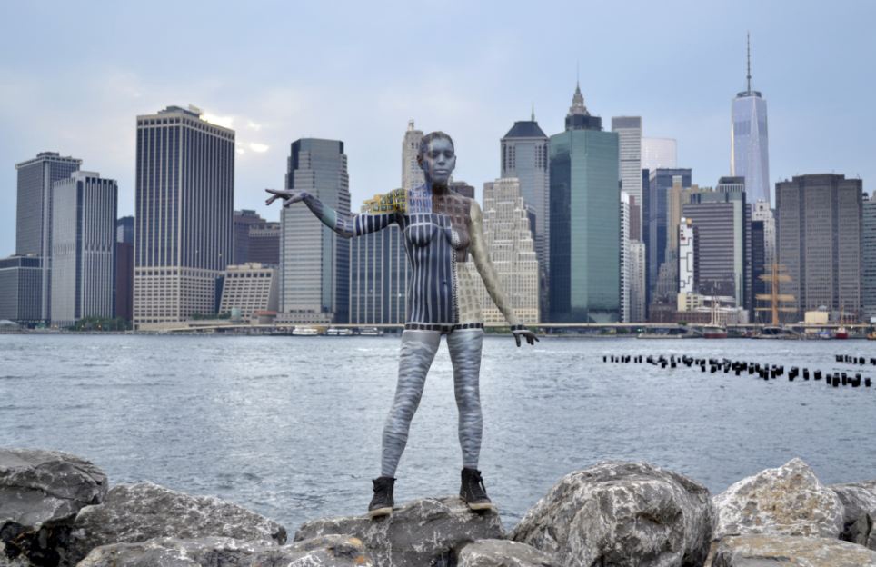 Họa sĩ vẽ trên cơ thể người Trina Merry thuê người mẫu mình trần để thể hiện ý tưởng độc đáo. Người mẫu trong bức ảnh hòa mình vào cây cầu Manhattan nổi tiếng. |