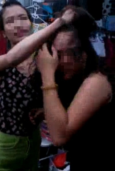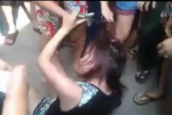 | Cô gái bị cho có hành vi trộm cắp bị túm tóc tại hiện trường. |