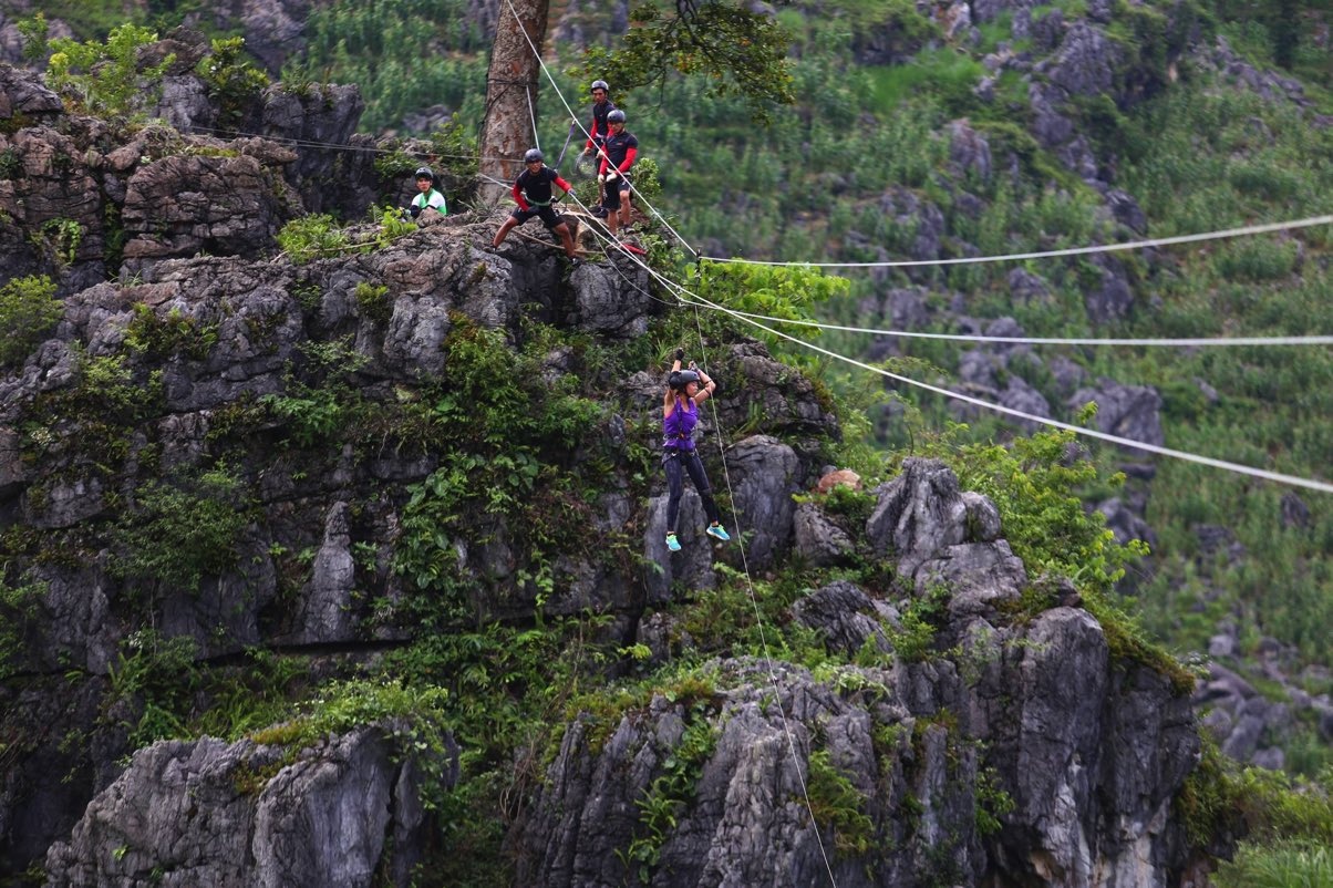 | Làm nền cho một trong những thử thách khó nhằn nhất cuộc chơi là khung cảnh tuyệt đẹp của núi đá Hà Giang. Tại dốc gần thôn Tò Đú thuộc thị trấn Mèo Vạc, các tay đua phải đi trên dây với quãng đường hơn 200m giữa hai mỏm núi chênh vênh. Khoảng cách từ dây cáp xuống các mỏm đá tai mèo sắc nhọn là hơn 60m - một độ sâu đủ làm nản lòng cả cascadeur chứ không chỉ các tay đua. |