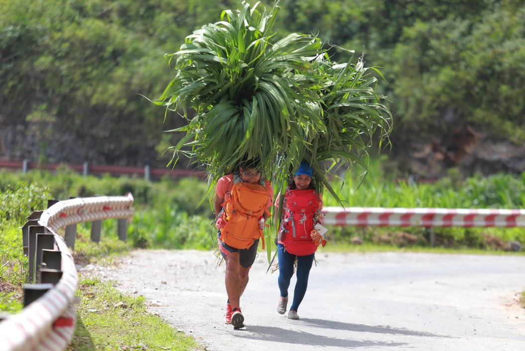 | Các cô gái, chàng trai của Cuộc đua kỳ thú thử sức với công việc quen thuộc của người dân vùng núi: đi bộ vác cỏ theo cung đường dài 2 km, mỗi bó cỏ nặng 15 kg. |