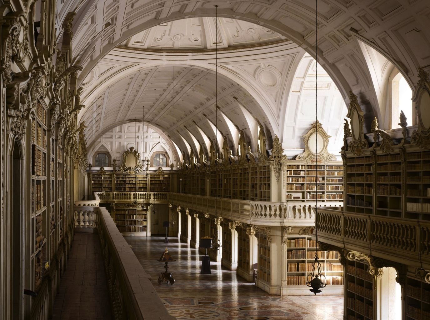 | Thư viện Mafra Palace ở Mafra, Bồ Đào Nha nổi tiếng với sàn nhà hình hoa hồng, các phiến đá cẩm thạch màu trắng và khoảng 35.000 cuốn sách bìa da. Ảnh: Rex |