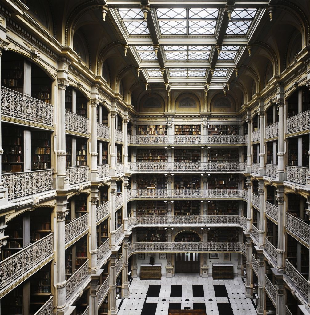 | Thư viện George Peabody ở Baltimore, Mỹ được xây dựng năm 1878. Thư viện đặc trưng với sàn nhà đá cẩm thạch màu đen, trắng và các ban công tuyệt đẹp. Ảnh: Rex |