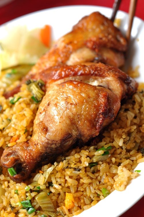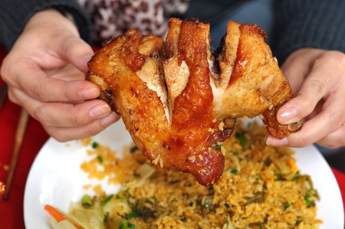Đúng như tên gọi, cơm rang nơi này kết hợp với gà quay. Ưu điểm là miếng gà trông mỡ màng, rất lớn, được chọn phần đùi, ăn ra cả má ngoài lan đến phần lườn gà nên nhìn vô cùng hấp dẫn. Gà của quán ngon, không bị bã bở, quay bên ngoài vàng ươm, bên trong mềm ngọt. Tuy nhiên, nhược điểm là cơm chiên hơi khô, song có nước luộc gà ăn kèm nên khách cũng đỡ khan miệng. Với mức gía 55.000 đồng/suất, phần cơm ở đây đầy đặn, đủ ấm bụng bữa trưa.