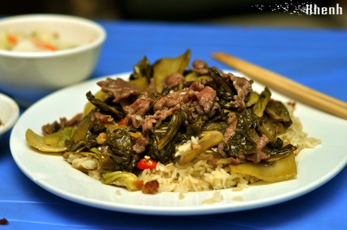 Quán chỉ bán từ tầm xẩm tối, chẳng hề có biển bảng, nhưng cứ đi đến cuối phố đoạn ngã ba giao với Châu Long hỏi thì ai cũng biết. Vẫn là món cơm rang dưa bò phổ biến song hiếm tiệm bình dân nào có hạt gạo dẻo và săn như ở đây. Chủ quán lại khéo, chiên cơm dẻo mà không bao giờ ngấy vì ngấm dầu mỡ. Bò xào dưa cũng đậm đà, vừa miệng, khách nào ăn thử cũng tấm tắc. Quán vỉa hè tuềnh toàng, thậm chí trông xập xệ nhưng tối đến khá nhiều “dân chơi” ghé ăn.