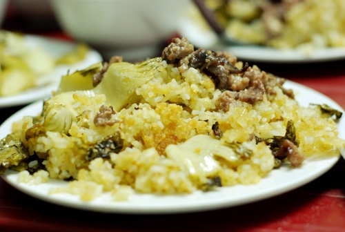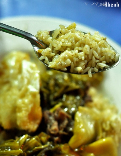 Khi ăn khách còn "khoái" hơn với cảm giác chỗ mềm mềm dẻo, chỗ giòn tan, cháy cạnh. Cơm kết hợp cùng dưa chua, thịt bò hoặc thịt gà và gia giảm vừa miệng chứ không cần rưới thêm nước mắm hay xì dầu.