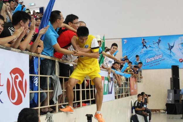 | Tình bạn cũng có thể là tình cảm cuồng nhiệt của các cổ động viên dành cho “gà nhà”. Chàng trai ĐH Xây Dựng bay lên khán đài để ăn mừng bàn thắng cùng cổ động viên nhà. |