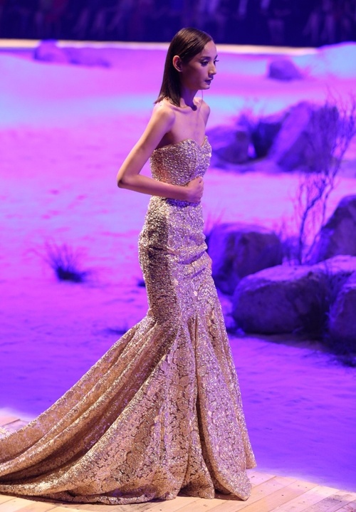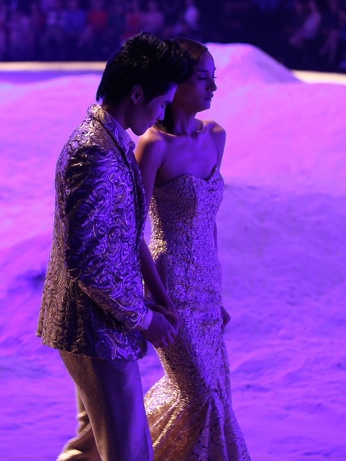 | Đuối sức và không thể xoay sở được với gót giày đã dính kẹt vào chân váy, Lê Thúy chực ngã khuỵu trên sàn catwalk khi trình diễn màn cuối trong show thời trang Sea of Memory của Đỗ Mạnh Cường. |