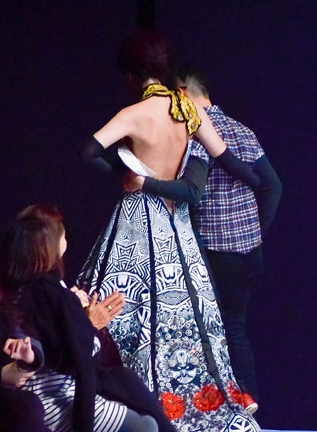 Tuy nhiên, ngay sau khi Ngọc Hân chậm rãi bước lên bục chính sàn catwalk, nhà thiết kế Hải Long đã vội vã chạy ra sân khấu khi thấy cả mảng lưng của cô lộ ra vì chiếc váy bị tuột khóa còn thân áo thì bị bục ra hai bên.