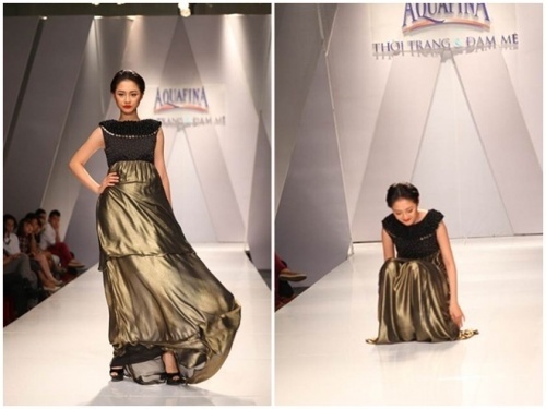 | Trong một show thời trang thường niên diễn ra vào tháng 6/2013, chân dài trưởng thành từ cuộc thi Vietnam's Next Top Model 2011 - Trà My dẫm phải gấu váy khi đang tự tin sải bước, nữ người mẫu bất ngờ té trên sàn diễn. Sau 1 phút diễn ra sự cố không đáng có, cô tự đứng dậy và tiếp tục phần trình diễn của mình. |