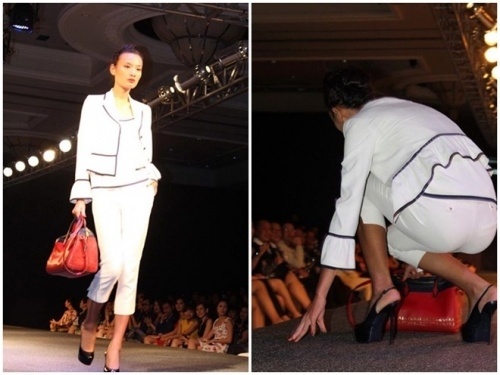Sàn diễn thời trang Việt chứng kiến không ít những cú ngã bất ngờ, tuy nhiên do rất nhiều yếu tố dẫn đến tai nạn này. Có thể kể đến những đôi guốc cao lênh khênh, khó đi, đường băng trơn hay váy áo lượt thượt, chất liệu quá cứng cũng là thủ phạm của những cú "vồ ếch" nhớ đời đó.