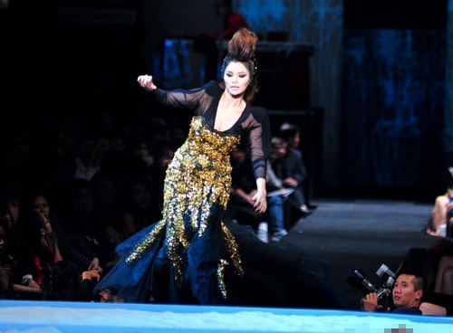 | Top 3 Vietnam's Next Top Model - Lê Thúy trượt chân hai lần trong show thời trang xuân hè, tối 28/4/2012, tại TP.HCM. Đôi guốc cao hơn 10 cm và sàn khá trơn vì vậy Lê Thúy đã té ngã khi xoay chuyển dáng. |