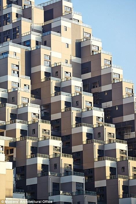 | Có kiến trúc giống kim tự tháp, tòa chung cư 18 tầng ở Côn Sơn (Trung Quốc) đã thu hút sự chú ý của nhiều người. Nhìn từ trên cao, công trình giống như một khối lego xếp chồng lên nhau mỗi góc 45 độ. Kiến trúc sư của công trình này cho biết ông đã lấy cảm hứng từ ruộng bậc thang truyền thống ở Trung Quốc và môn thể thao parkour để hình thành nên tòa nhà. Ảnh: Daily Mail. |