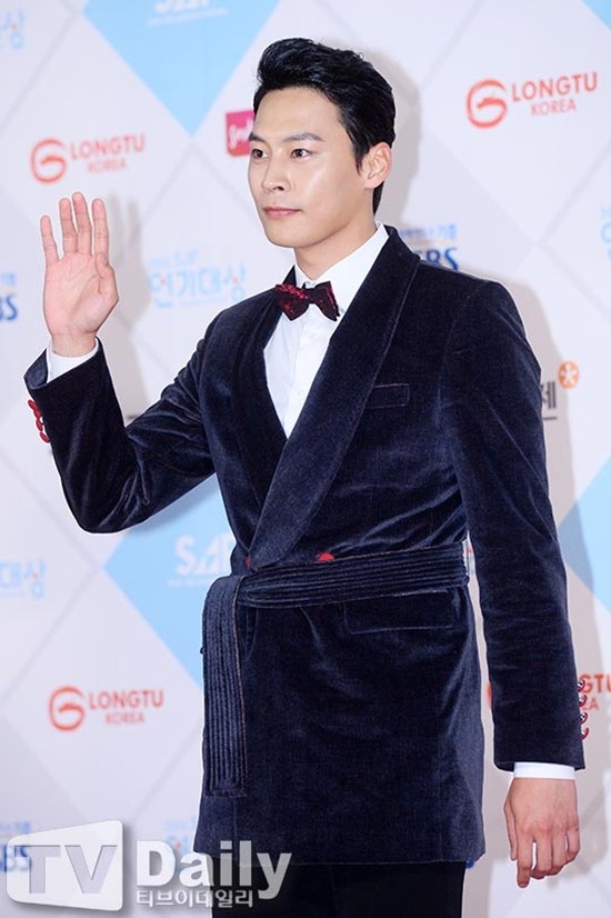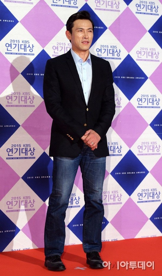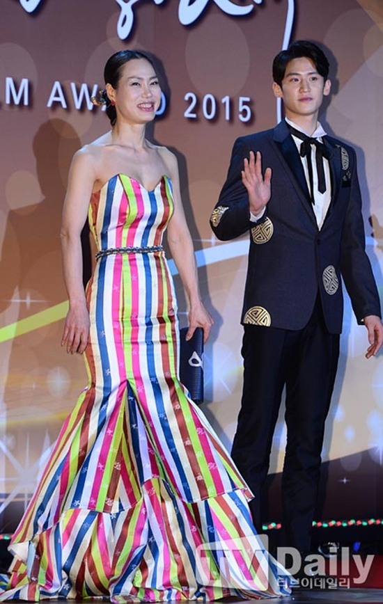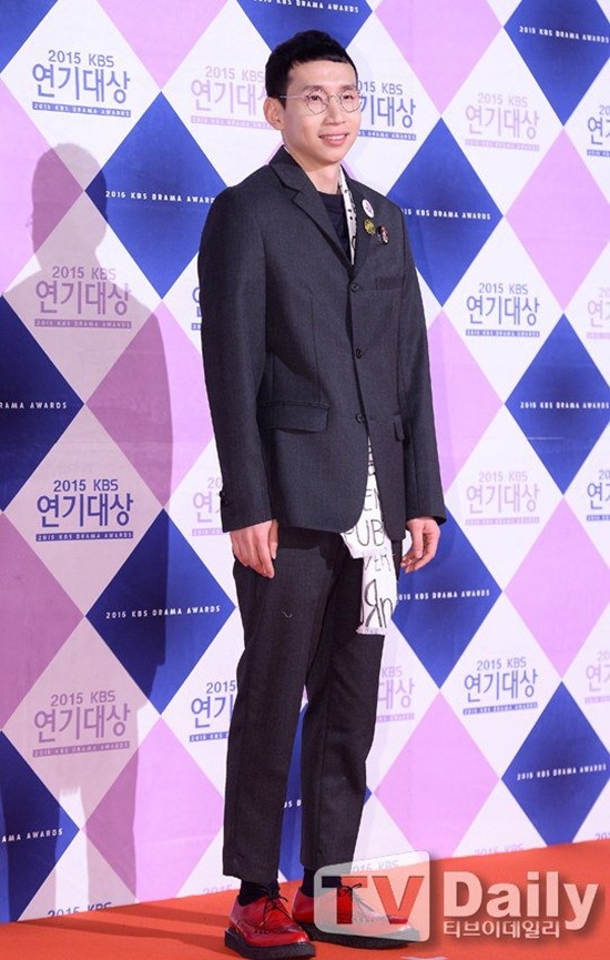 Yoo Oh Seung trông già hơn khi mặc quần jeans với áo vest lên thảm đỏ. |