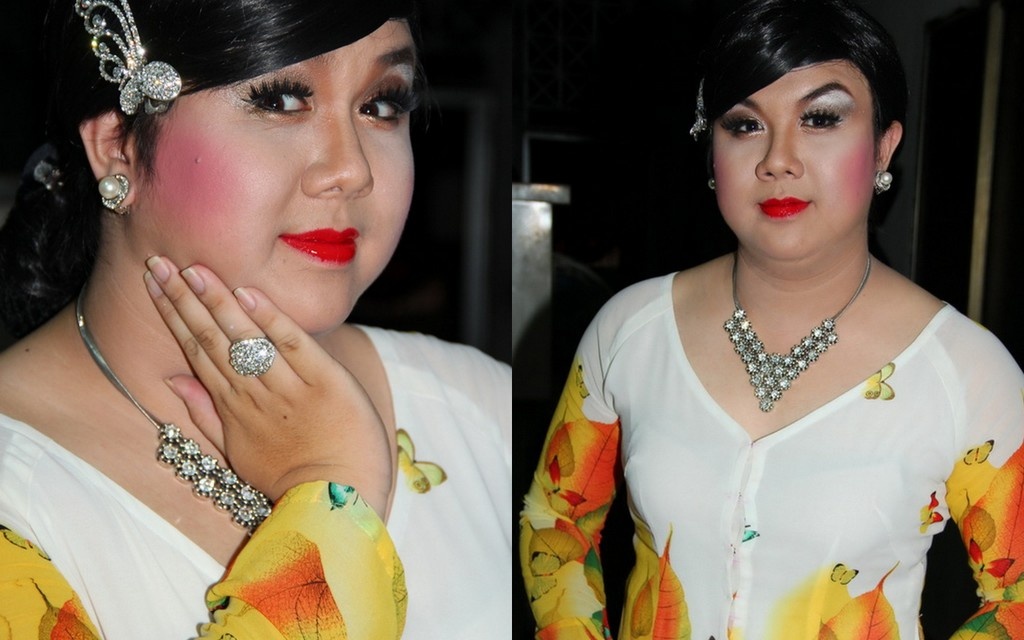 | Trong khi đó, 'thiếu nữ" Xuân Bắc dịu dàng ra mắt đồng nghiệp sau hàng giờ ngồi hoá trang trước gương. |