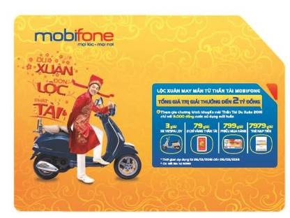 Mỗi thuê bao trả trước và trả sau tiêu dùng tối thiểu 9.000 đồng/tuần sẽ được tặng mã khuyến mãi tương ứng và tham gia chương trình ghép chữ nhận quà Thần Tài MobiFone Du Xuân 2016: - 3 giải thưởng VESPA LXV 3 V i.e cho thuê bao sở hữu bộ chữ THẦN - TÀI - MOBIFONE - DU - XUÂN - 2016. - 79 giải thưởng 2 chỉ vàng Thần Tài cho thuê bao sở hữu bộ chữ THẦN - TÀI - MOBIFONE - DU - XUÂN. - 799 phiếu mua hàng trị giá 500.000đ khi sưu tập được bộ chữ THẦN - TÀI - DU - XUÂN. - 7.979 thẻ cào mệnh giá 100.000đ với bộ chữ THẦN - TÀI. Chương trình bắt đầu từ ngày 26/1 đến hết ngày 6/3. Mọi thông tin chi tiết liên hệ tổng đài 9090 hoặc www.duxuandonlocphattai.com |