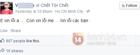 Trước khi quyết định nhảy cầu Tân Thuận (quận 7) tự tử, cô gái trẻ đã đăng tải dòng trạng thái lên Facebook: "Em xin lỗi anh.... Con xin lỗi mẹ... Xin lỗi các bạn".
