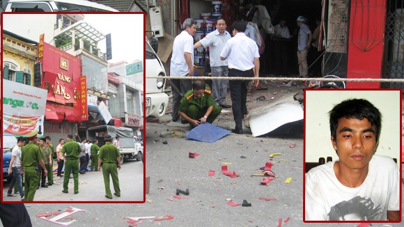 | Hiện trường và thanh niên ôm mìn cướp tiệm vàng giữa Thủ đô khiến 15 người bị thương. |