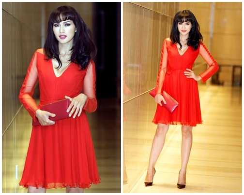 | Mẫu váy từng được Anh Thư mặc cách đó không lâu. Thiết kế hiện đại, năng động và không quá hở giúp Anh Thư lọt mỹ nhân đẹp nhất tuần. Bộ đầm được Hương Giang mặc lại cho thấy Anh Thư từng mượn NTK mẫu váy này khi dự sự kiện. |