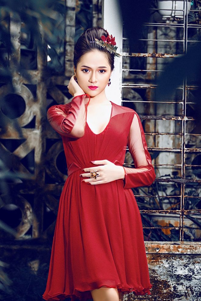 | Trong bộ ảnh mới nhất, Hương Giang hóa thân gợi cảm và quyến rũ với tông màu đỏ. Thiết kế của Lê Thanh Hòa. |