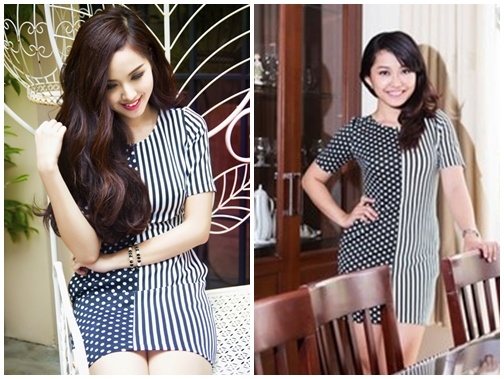 Hotgirl Tâm Tít mặc lại một thiết kế kẻ sọc, chấm bi mà diễn viên Anh Đào từng sở hữu cách đây hơn 2 tháng,