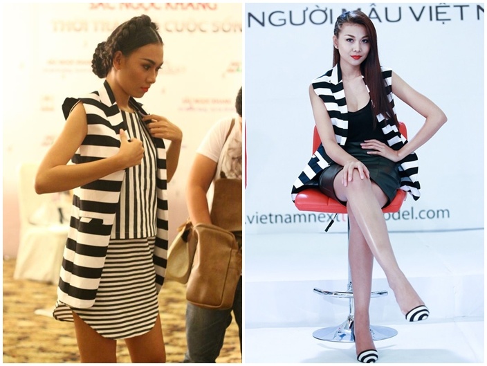 Thanh Hằng tạo ấn tượng thời trang khi ngồi ''ghế nóng'' Vietnam's Next Top Model, nhưng trước đó ít ai biết, người mẫu Diệu Huyền cũng từng diện trang phục giống như đúc. Cả hai đều là người mẫu nên khó có thể đưa ra nhận xét ai mặc đẹp hơn, nhưng rõ ràng với cách phối hợp cùng chân váy chất da, áo đồng tông và giày ăn nhập, Thanh Hằng ghi điểm cộng.