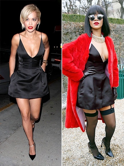 | Cùng là một chiếc LBD nhưng "tắc kè hoa" Rita Ora lại chọn cách mix đơn giản khi đeo thêm vòng tay cá tính và đi đôi ankle trap mũi nhọn. Trong khi đó, "biểu tượng thời trang 2014" Rihanna lại cá tính mix cùng tất cao cổ, necklace to bản và áo khoác lông màu đỏ rực rỡ. |