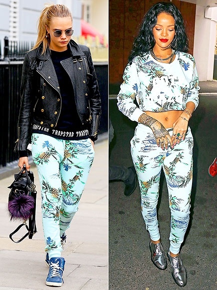 | Trang phục họa tiết hoa quả nhiệt đới này rất hợp với những cô nàng sôi nổi như Cara và Rihanna. Trong khi Cara Delevigne chọn t-shirt, jacket da màu đen cá tính để mix cùng thì cô nàng Riri trông khỏe khoắn với áo croptop cùng họa tiết. |