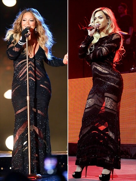 | Với chiếc váy xuyên thấu của Roberto Cavalli thì có vẻ, Beyonce đã ghi điểm khi khoe được đường cong gợi cảm của mình so với Mariah Carey. |