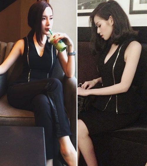 | Chiếc áo đen ôm sát với chi tiết dây khóa trang trí hai bên tuy đơn giản nhưng vẫn mang đến cho hai cô nàng vẻ sang trọng, gợi cảm. Phương Trinh kết hợp áo cùng quần đen còn Tâm Tít nữ tính hơn với chân váy bút chì. |