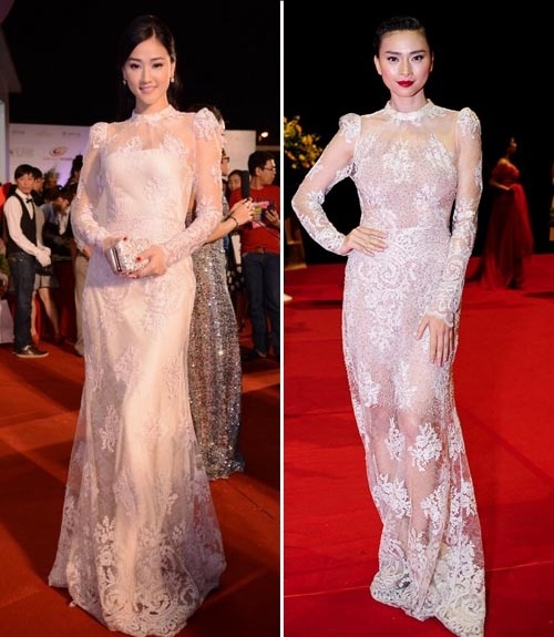 | Cả Maya và Ngô Thanh Vân cùng chọn mặc chiếc đầm ren hoa văn của nhà thiết kế Phương My trong hai sự kiện cách nhau khá lâu. Trang phục tuy kín đáo nhưng vẫn giúp người mặc khoe vẻ gợi cảm, nữ tính. |