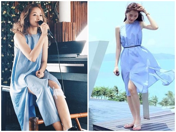 | Song trước giọng ca Hà thành, Đặng Thu Thảo và Trương Thị May từng diện bộ trang phục tương tự dự sự kiện làng giải trí, tại TP HCM. |