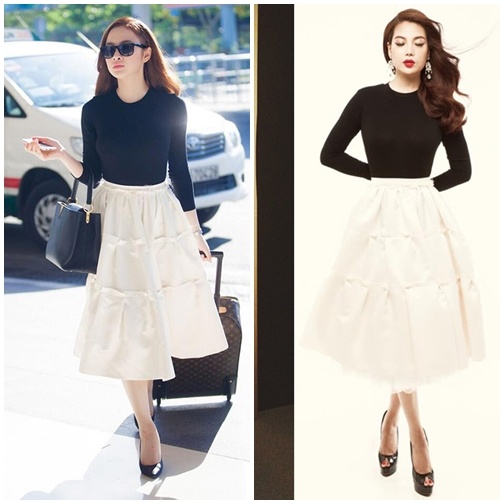 | Bộ cánh áo thun đen, chân váy diềm ly nhỏ được Angela Phương Trinh và Trương Ngọc Ánh lựa chọn. Thiết kế cổ điển phù hợp vóc dáng chuẩn của hai người đẹp cách nhau gần 20 tuổi. |